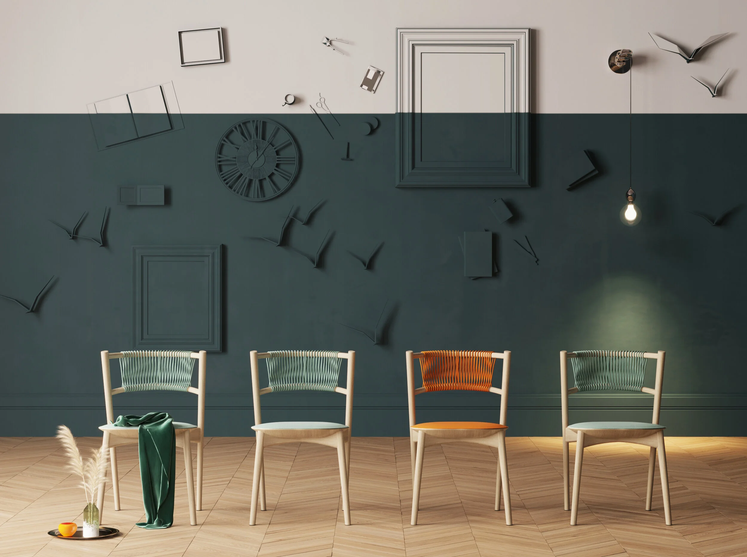 This delicate dining chair is designed to celebrate summer and dinner parties. Sophisticated sculptural shape is spiced up with bright upholstery and matching rope.
